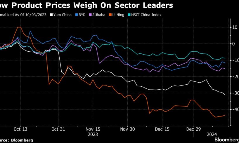 Gauges of consumer stocks have been the worst performers on the MSCI China Index since the end of September, after the real estate measure. The aggregate market value of companies included in the two consumer indexes has fallen by about $157 billion since. And the biggest drags on the MSCI benchmark in this span include e-commerce giant Alibaba Group Holding Ltd., restaurant operator Yum China Holdings Inc. and EV maker BYD Co. — which have all been offering big discounts.